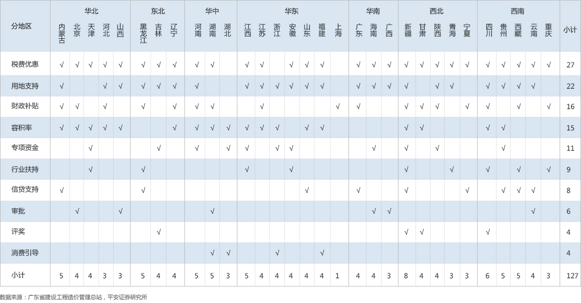 1、目前,全國31個(gè)省份均發(fā)布了相關(guān)的激勵(lì)政策,各省市裝配式支持政策類型主要包括:用地支持、財(cái)政補(bǔ)貼、專項(xiàng)資金、稅費(fèi)優(yōu)惠、容積率、評獎(jiǎng)、信貸支持、審批、消費(fèi)引導(dǎo)、行業(yè)扶持等10個(gè)小類。 2、在政策使用比例方面,稅費(fèi)優(yōu)惠政策超過90% ,其次為用地支持、財(cái)政補(bǔ)貼和容積率均超過50%,最后依次是專項(xiàng)資金、信貸支持、行業(yè)扶持、審批、評獎(jiǎng)、消費(fèi)引導(dǎo)。 3、激勵(lì)政策條款數(shù)量靠前的省份依次是新疆、四川、黑龍江、河南、湖南、內(nèi)蒙古、江西、貴州、西藏等。